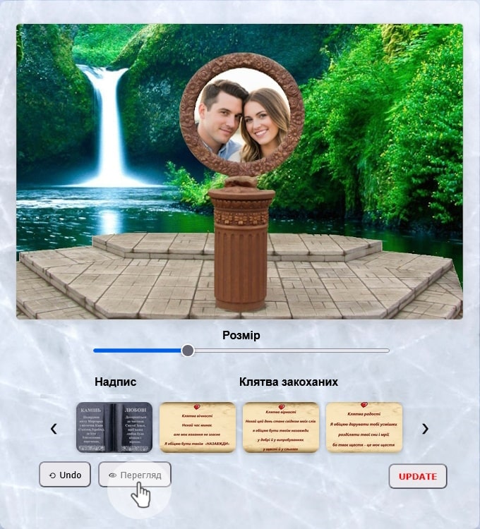 Рухайте картинки: Картинку можна рухати на великому полотні (шаблон з постаментом "Камінь любові"), перетягніть її в потрібне місце.